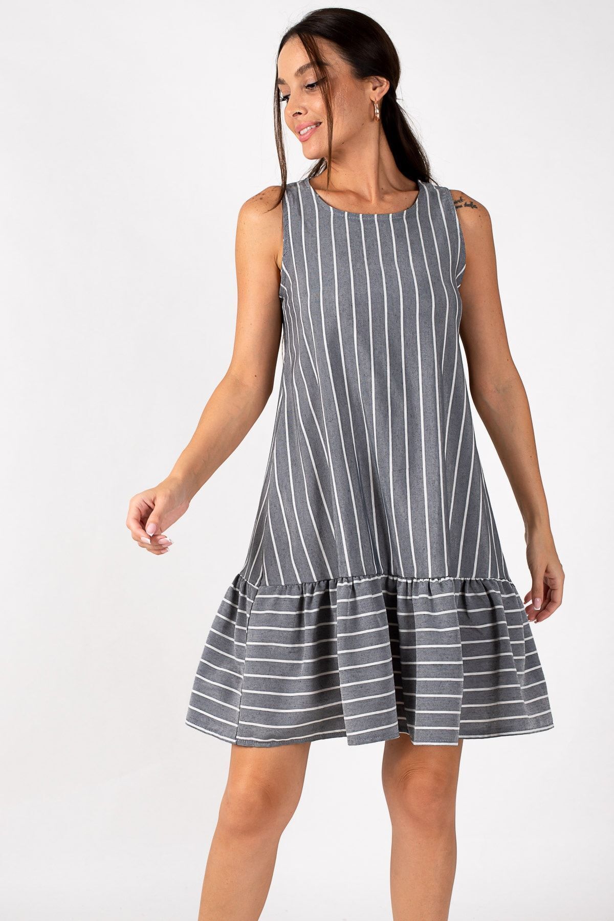 فستان قصير تريند مخطط بياقة V بدون أكمام مع أربطة على الكتف وكشكش بطبقات يعطيك لوك يومي شيك ومريح.