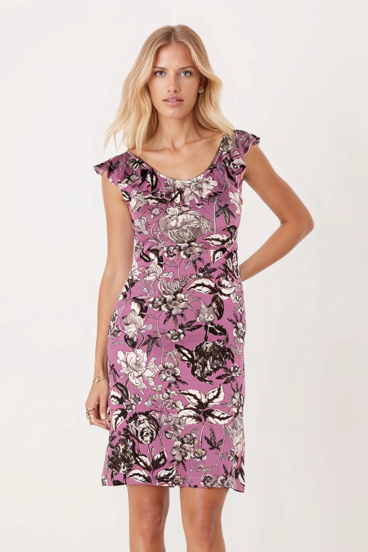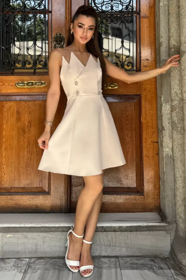 فستان قصير شيك بياقة V واكمام كشكش مع تفصيل ربطة وقماش ناعم يعطي لوك انثوي وانيق للصيف.