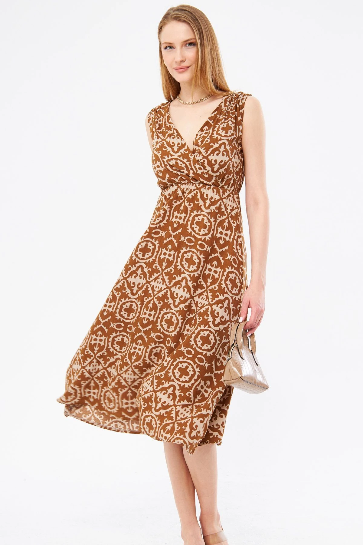 فستان نسائي قصير بنقشة بياقة مربعة وقصة ضيقة مع شورت داخلي يعطي راحة ولوك عصري مناسب للاطلالات اليومية.