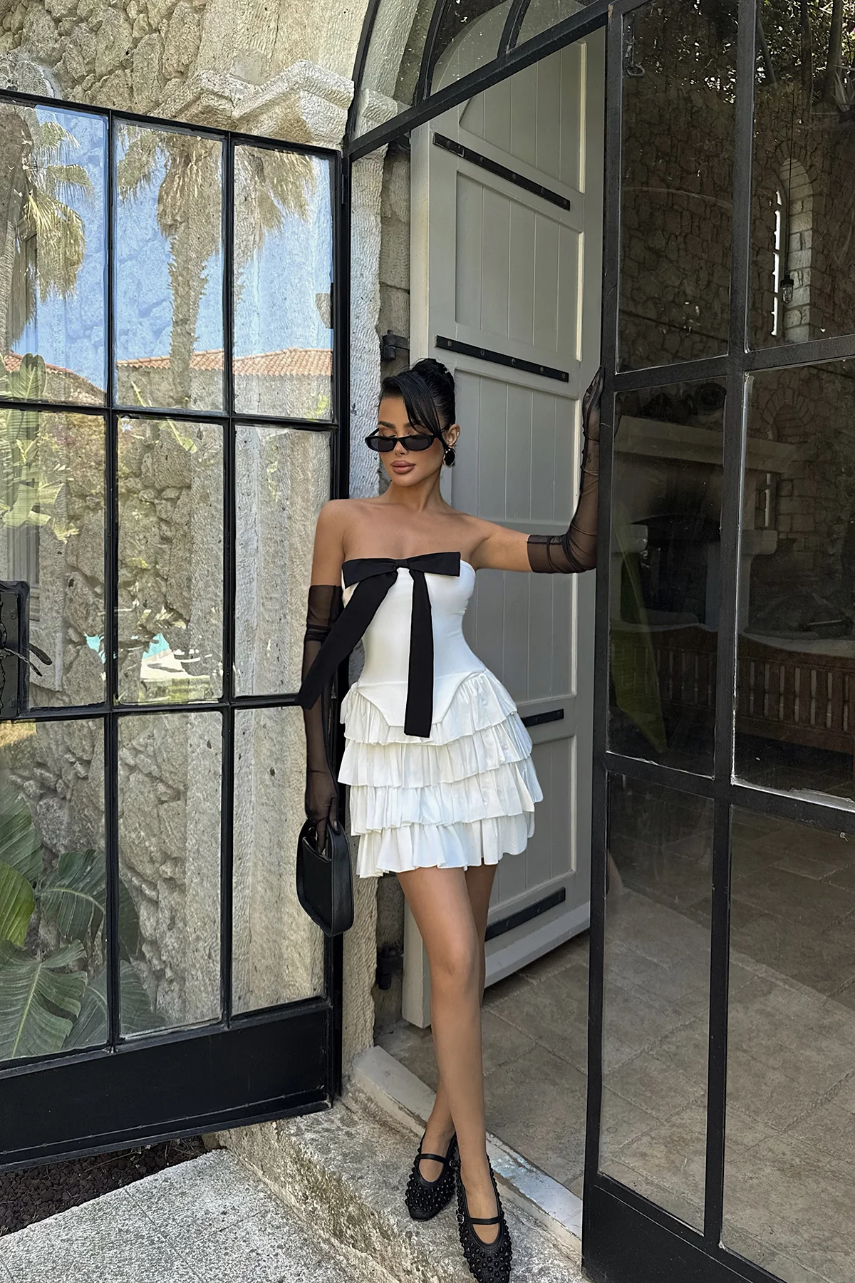 الموديل ترتدي مقاس S – الطول 175 سم، الصدر 85 سم، الخصر 62 سم، الورك 91 سم