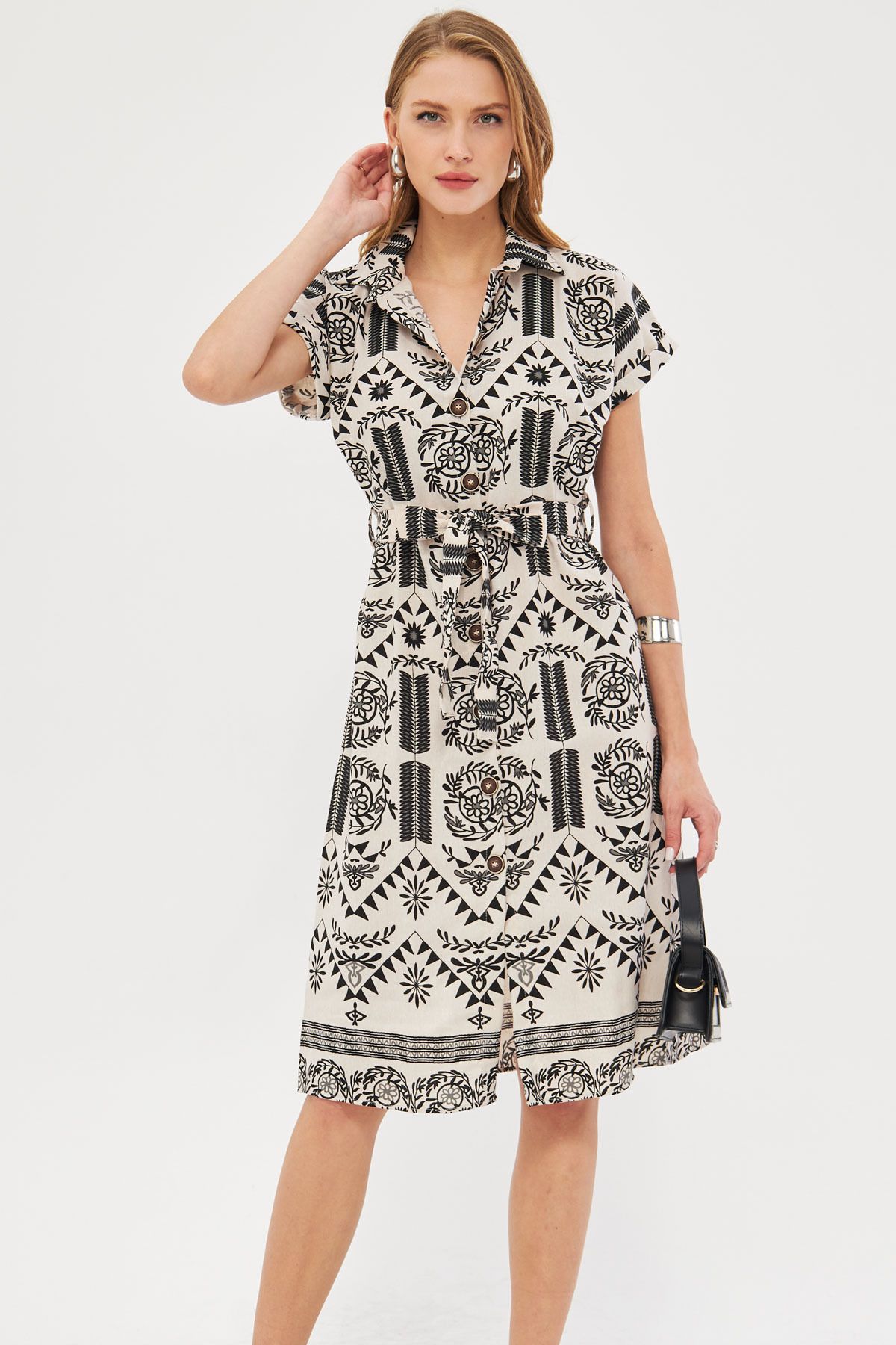 فستان تريند بياقة قميص وأكمام بالون مع تفصيل شق وقصة كلوش يعطيك لوك يومي شيك ومريح وسهل التنسيق.