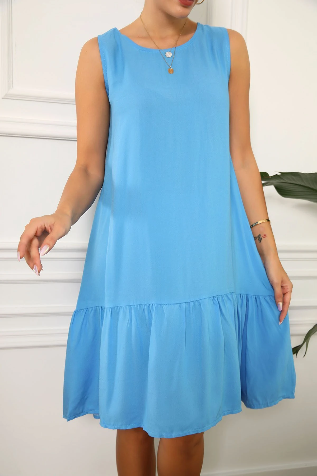 فستان قصير تريند مزهر بياقة V وتفصيل كشكش مع قصة A يعطيك لوك يومي شيك ومريح للصيف.