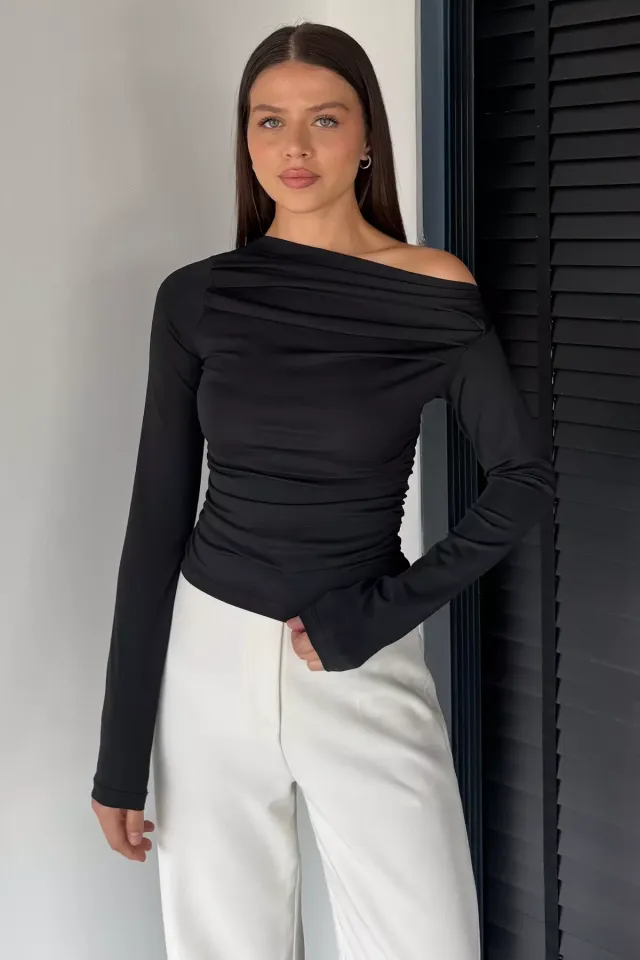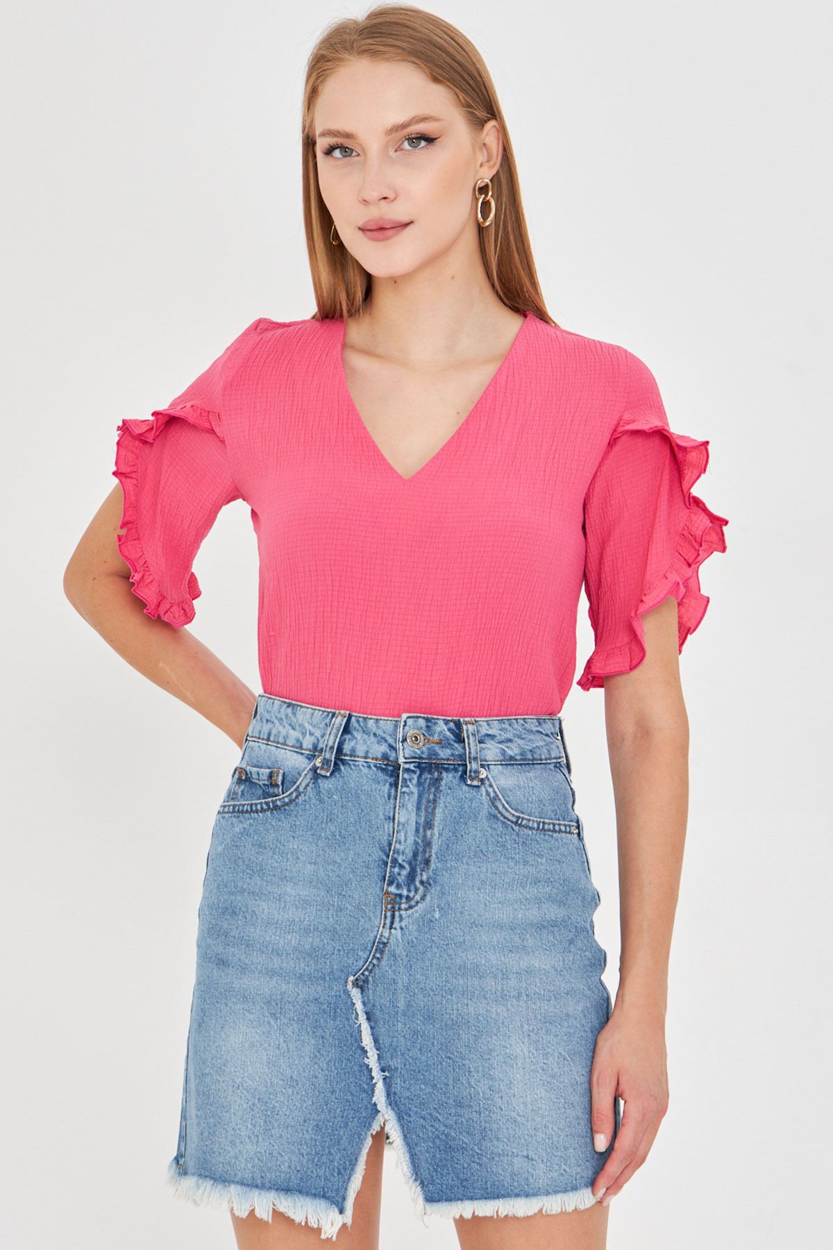 بلوزة بياقة V من الامام والخلف مع ربطة في الظهر تعطي لوك انيق وناعم بستايل عصري مناسب للاطلالات اليومية.