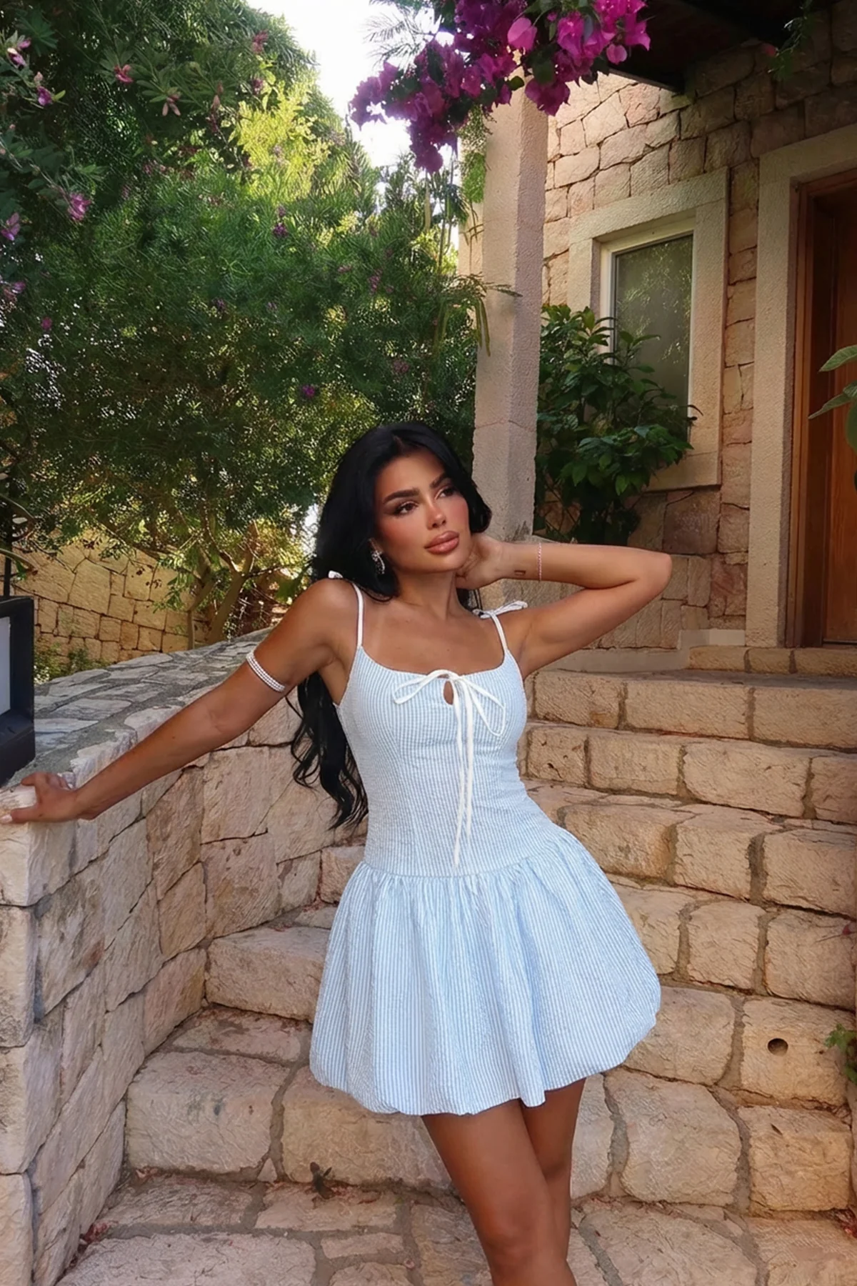 فستان قصير شيك بياقة V واكمام كشكش مع تفصيل ربطة وقماش ناعم يعطي لوك انثوي وانيق للصيف.