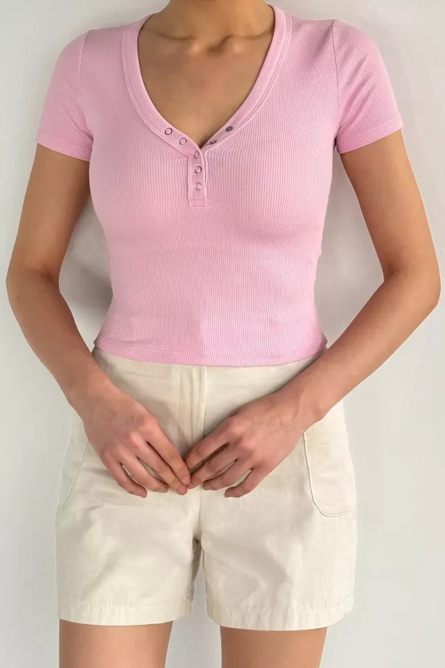بلوزة مريحة بياقة V واكمام كشكش تعطي لوك كيوت وناعم بستايل عصري مناسب للاطلالات اليومية الصيفية.