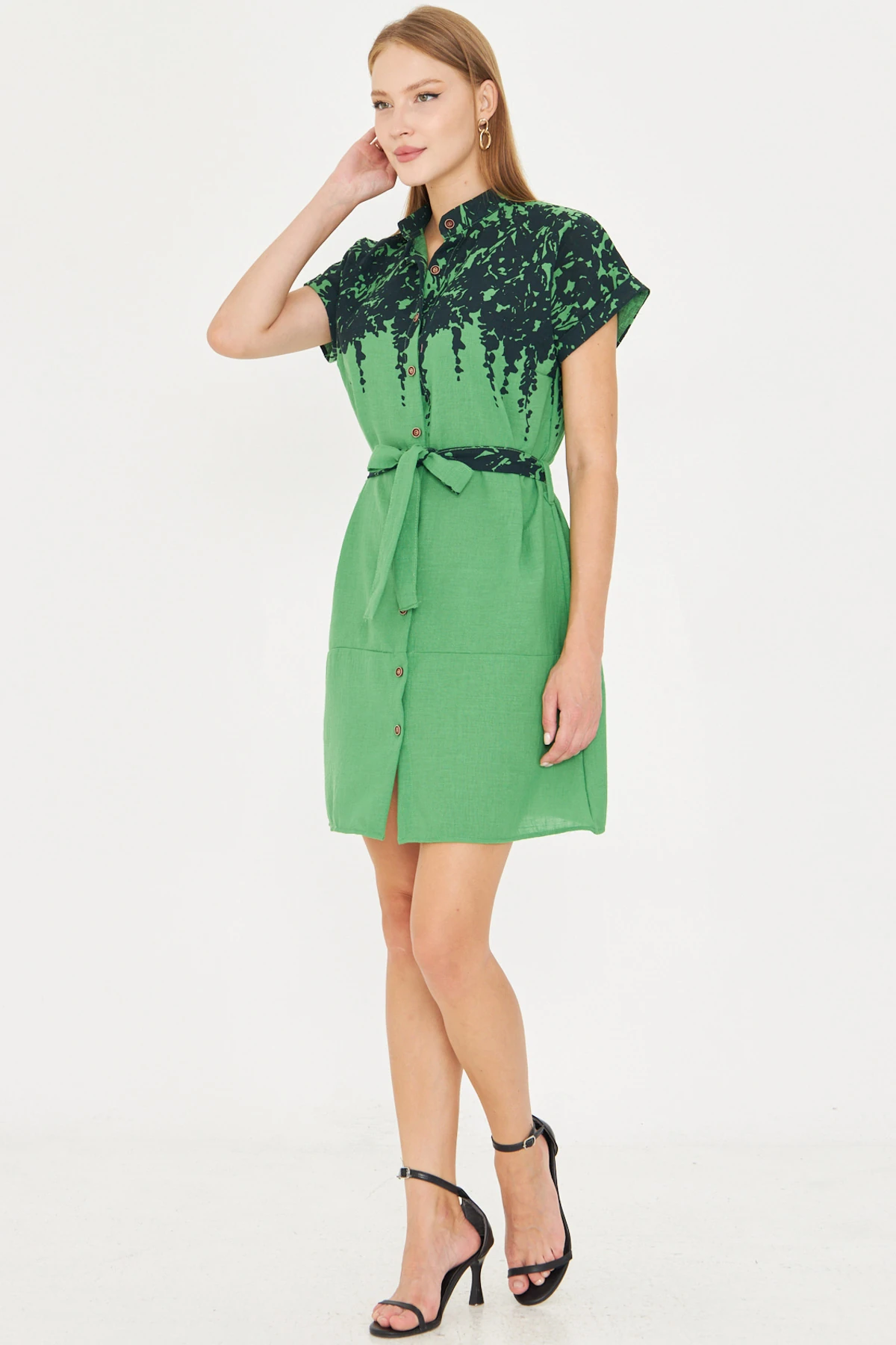 الموديل ترتدي مقاس XS – الطول 158 سم، الوزن 52 كغ، الصدر 80 سم، الخصر 62 سم، الورك 93 سم