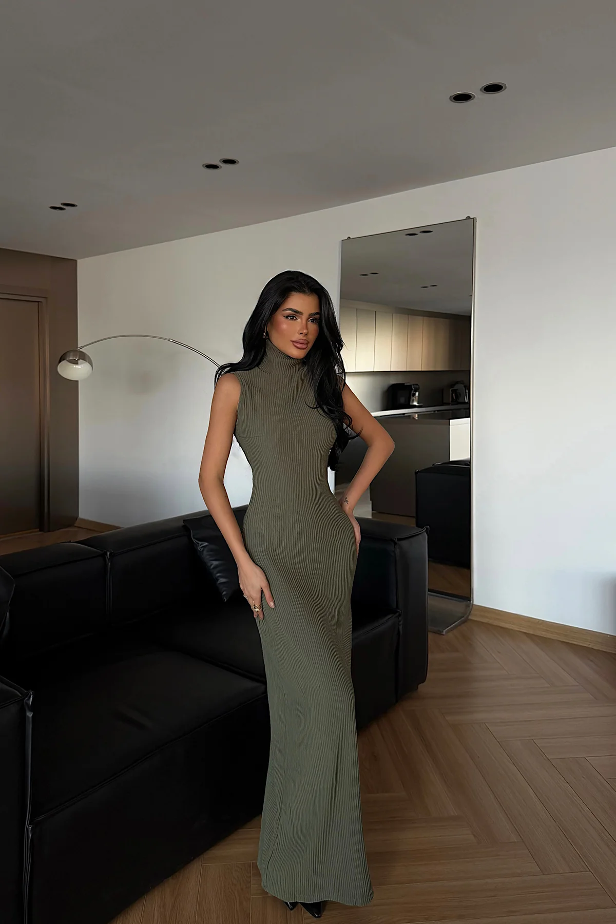الموديل ترتدي مقاس XS – الطول 160 سم، الوزن 50 كغ، الصدر 80 سم، الخصر 62 سم، الورك 94 سم