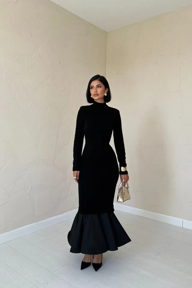 فستان طويل ضيق بدون حمالات بياقة قلب مع تفصيل كورسيه وعقدة يعطي شكل محدد وانثوي ولمسة جذابة للمناسبات.