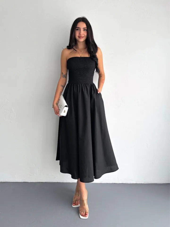 فستان طويل بدون حمالات بطيات وقصة كلوش - Beyond Store