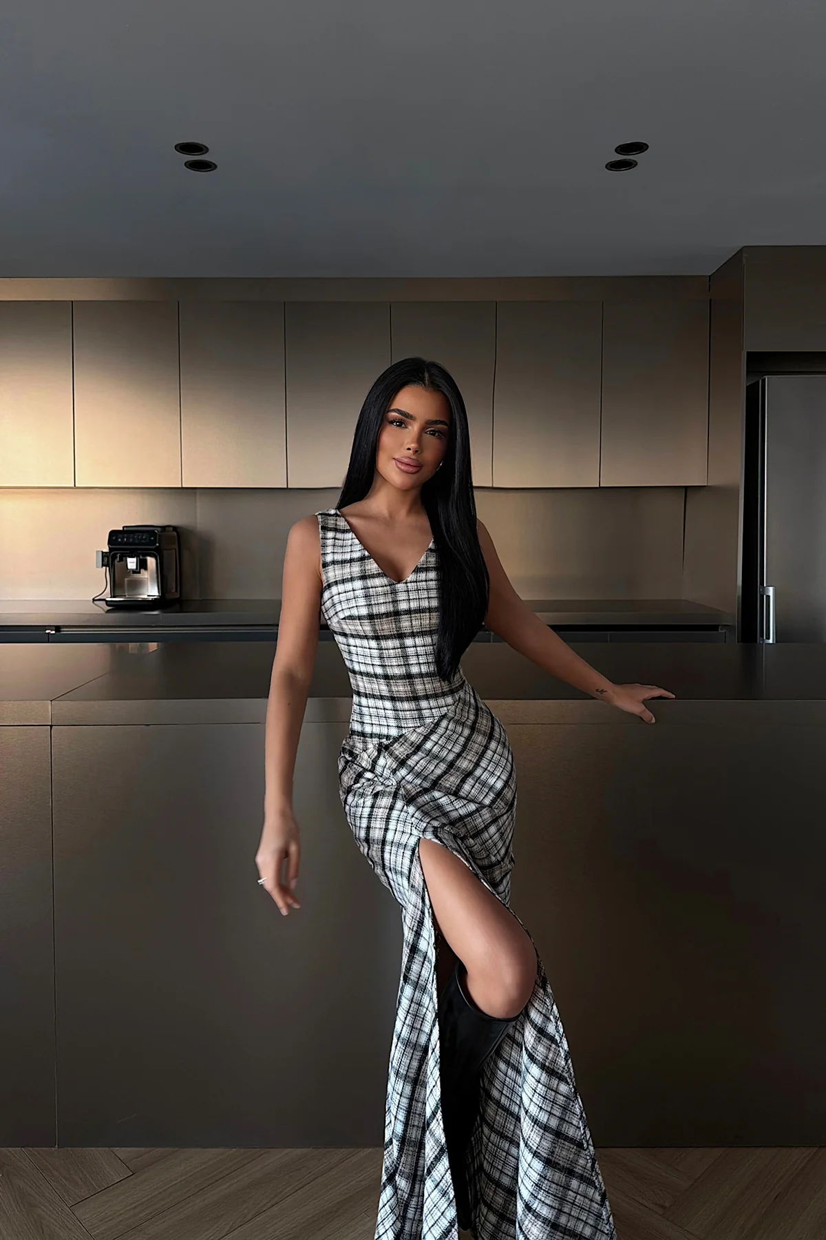 الموديل ترتدي مقاس XS – الطول 160 سم، الوزن 50 كغ، الصدر 80 سم، الخصر 62 سم، الورك 94 سم