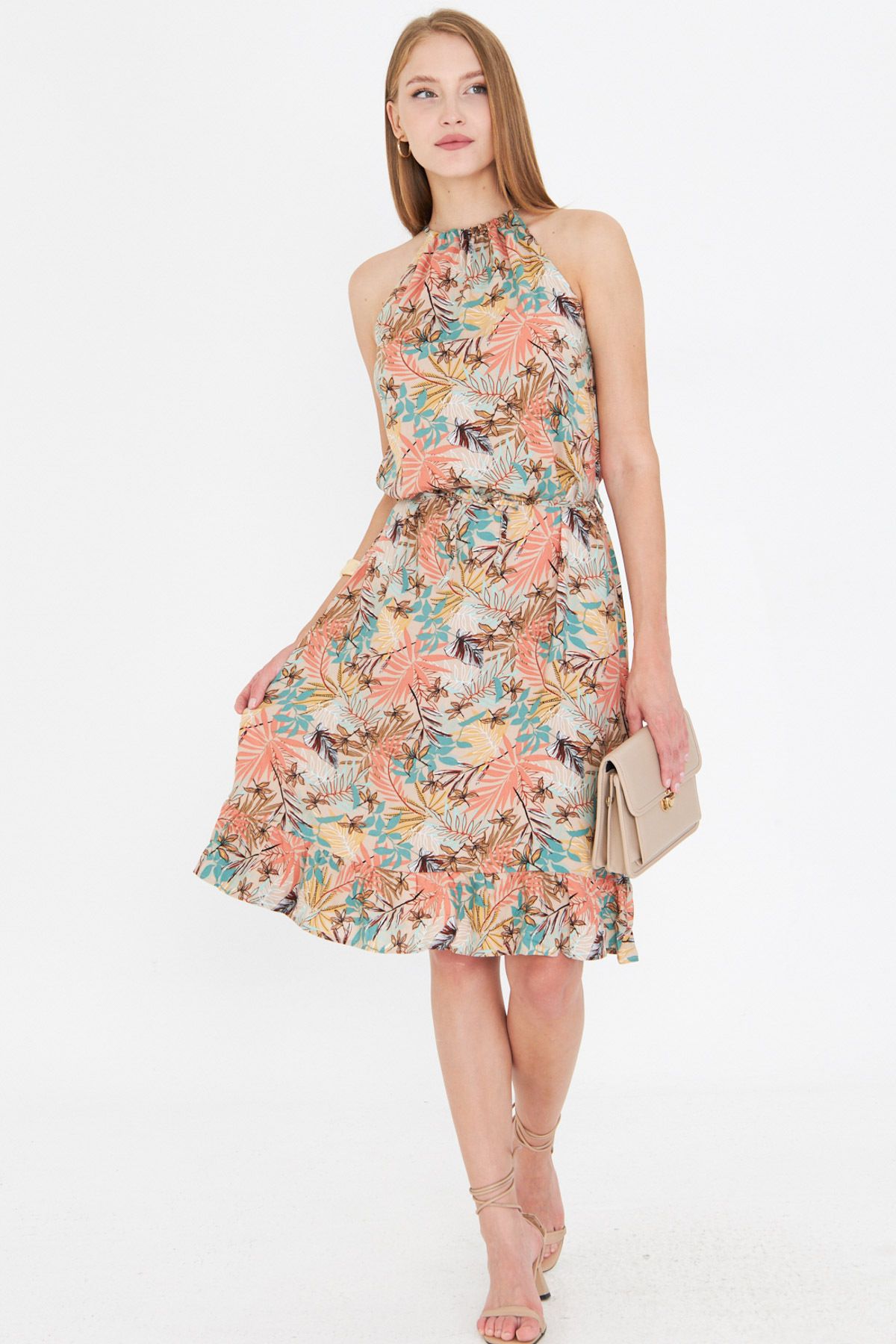 الموديل ترتدي مقاس XS – الطول 160 سم، الوزن 50 كغ، الصدر 80 سم، الخصر 62 سم، الورك 94 سم