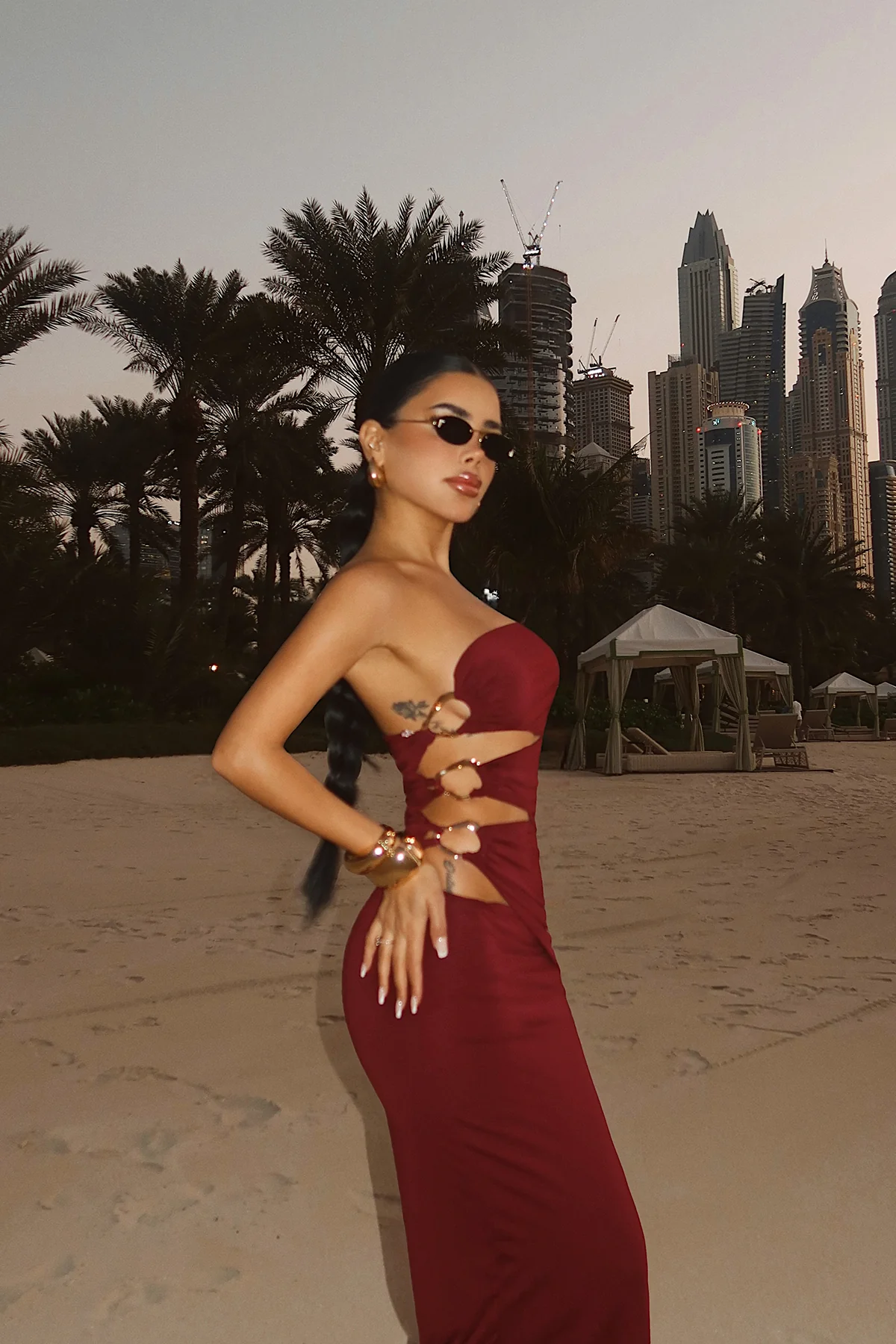 فستان نسائي طويل أنيق بلا حمالة مع ترتر ولمسات تفاصيل مُجمّعة يعطي لوك أنثوي جريء ومناسب للمناسبات.