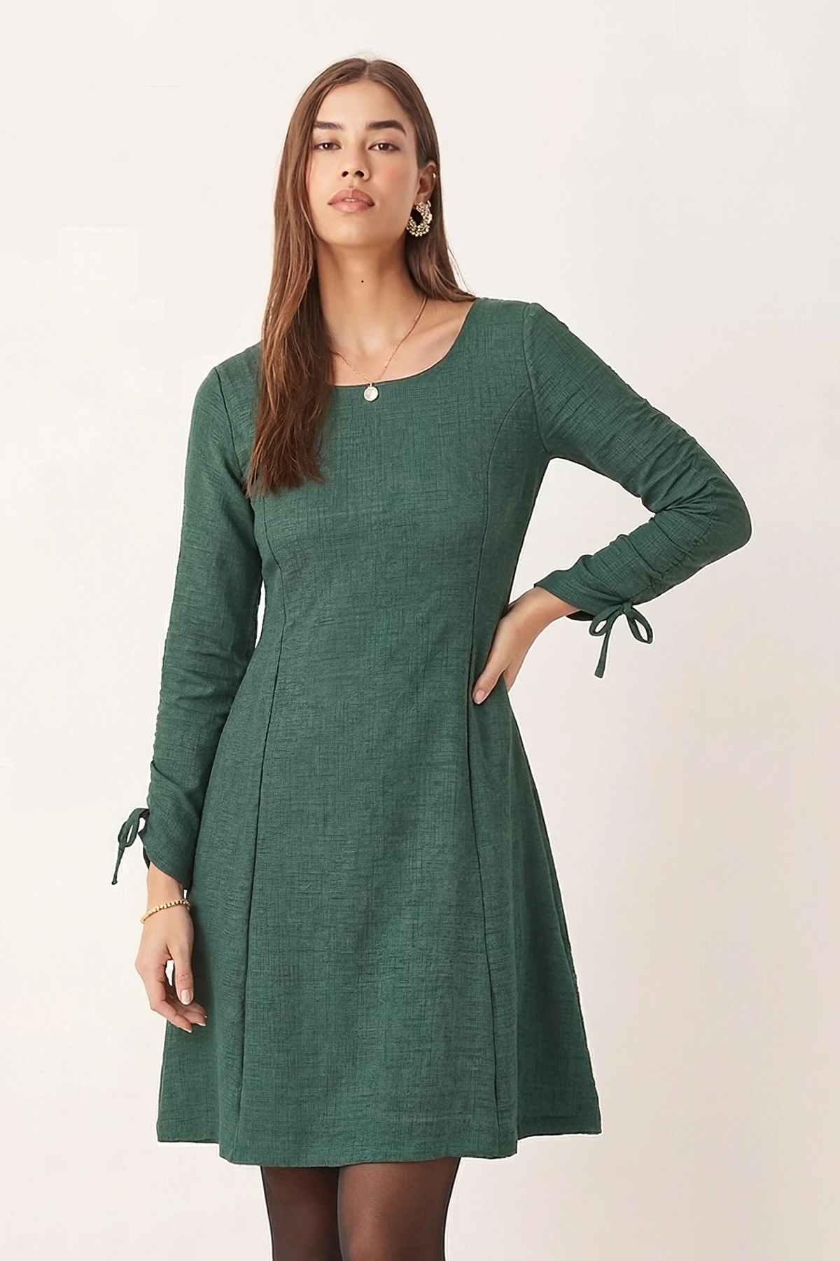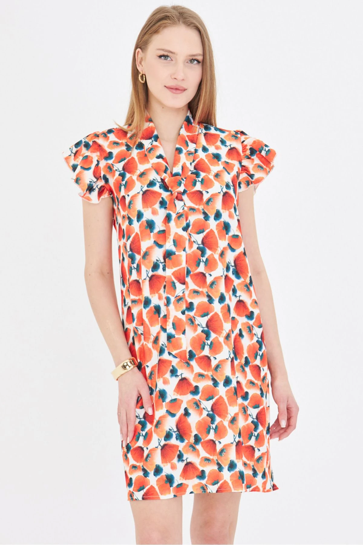 الموديل ترتدي مقاس XS – الطول 160 سم، الوزن 52 كغ، الصدر 80 سم، الخصر 62 سم، الورك 93 سم