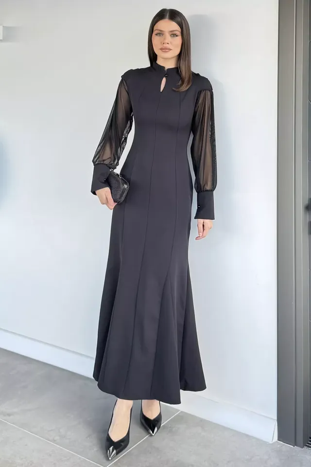 فستان طويل ضيق بقصة ذيل السمكة بدون أكمام مع ترتر يعطي شكل ممدود وانسيابي ويبرز الجسم بأسلوب أنيق.