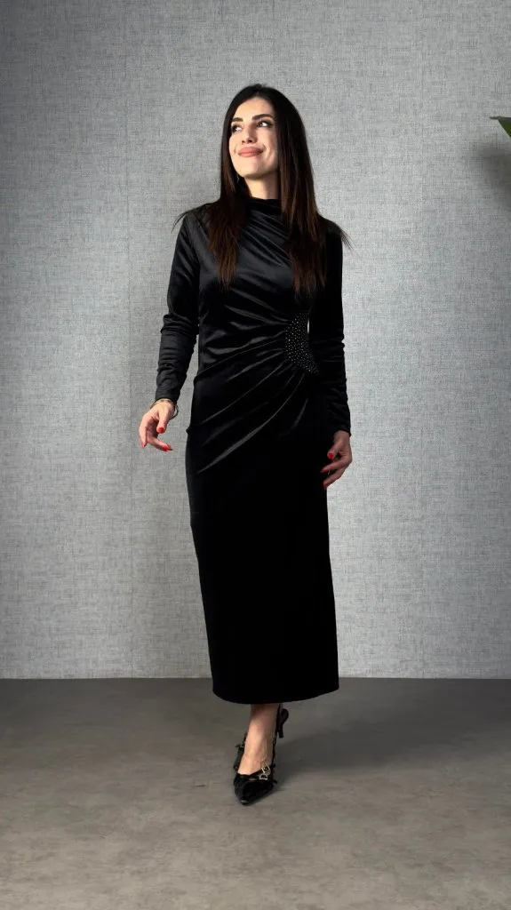 فستان طويل من التول بتفصيل درز وقصة محددة يعطي لوك ناعم وانسيابي بلمسة أنثوية أنيقة.