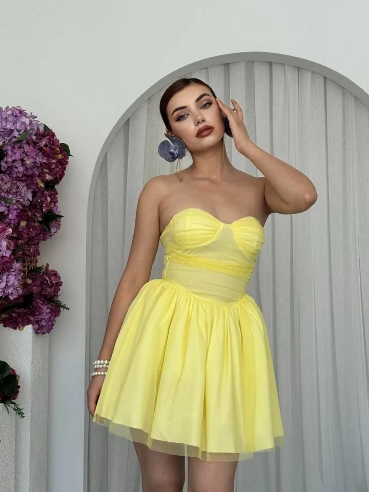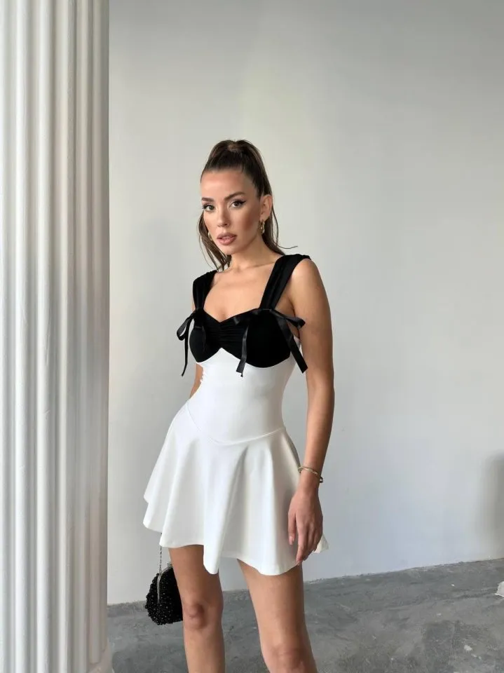 فستان نسائي مزهر قصير بياقة دائرية وحمالات عريضة مع خصر مطاطي بتفصيل جيبه يعطي راحة ولوك صيفي ناعم.