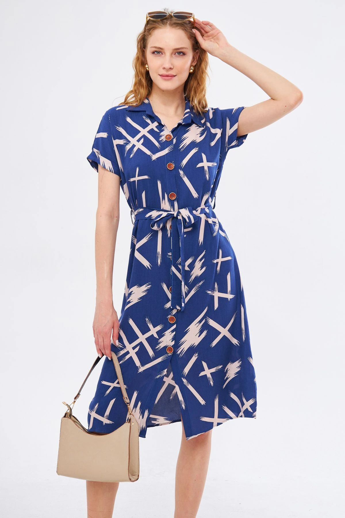 فستان تريكو مضلع تريند بقصة محددة وياقة بأزرار يعطي لوك عصري ومريح مناسب للاستخدام اليومي.
