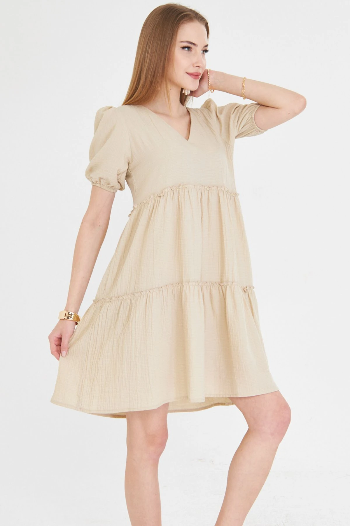 فستان قصير تريند بياقة قميص وأكمام كاب مع جيب مزدوج يعطيك لوك يومي شيك ومريح وسهل التنسيق.