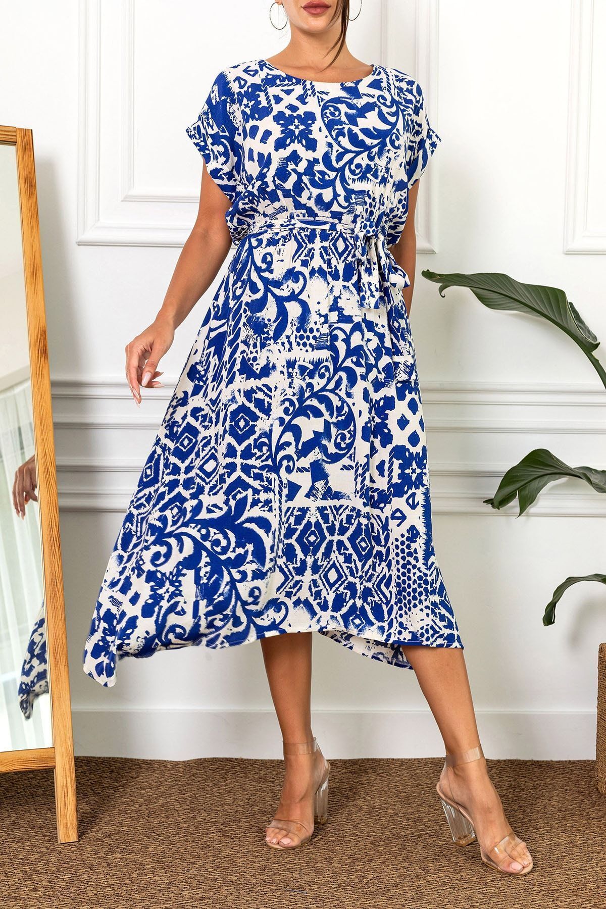 فستان ميدي مريح بنسيج مضلع وياقة قميص مع تفصيل سحاب يعطي لوك عصري وانيق مناسب للاستخدام اليومي.