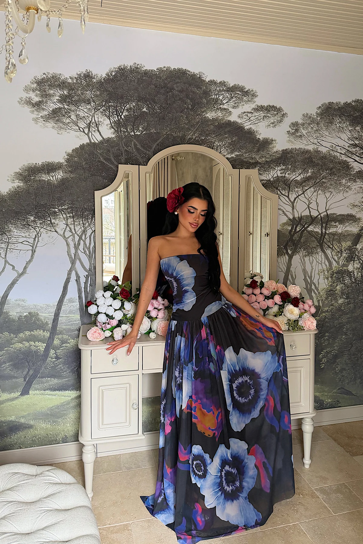الموديل ترتدي مقاس 36 – الطول 172 سم، الوزن 65 كغ، الصدر 85 سم، الخصر 66 سم، الورك 93 سم