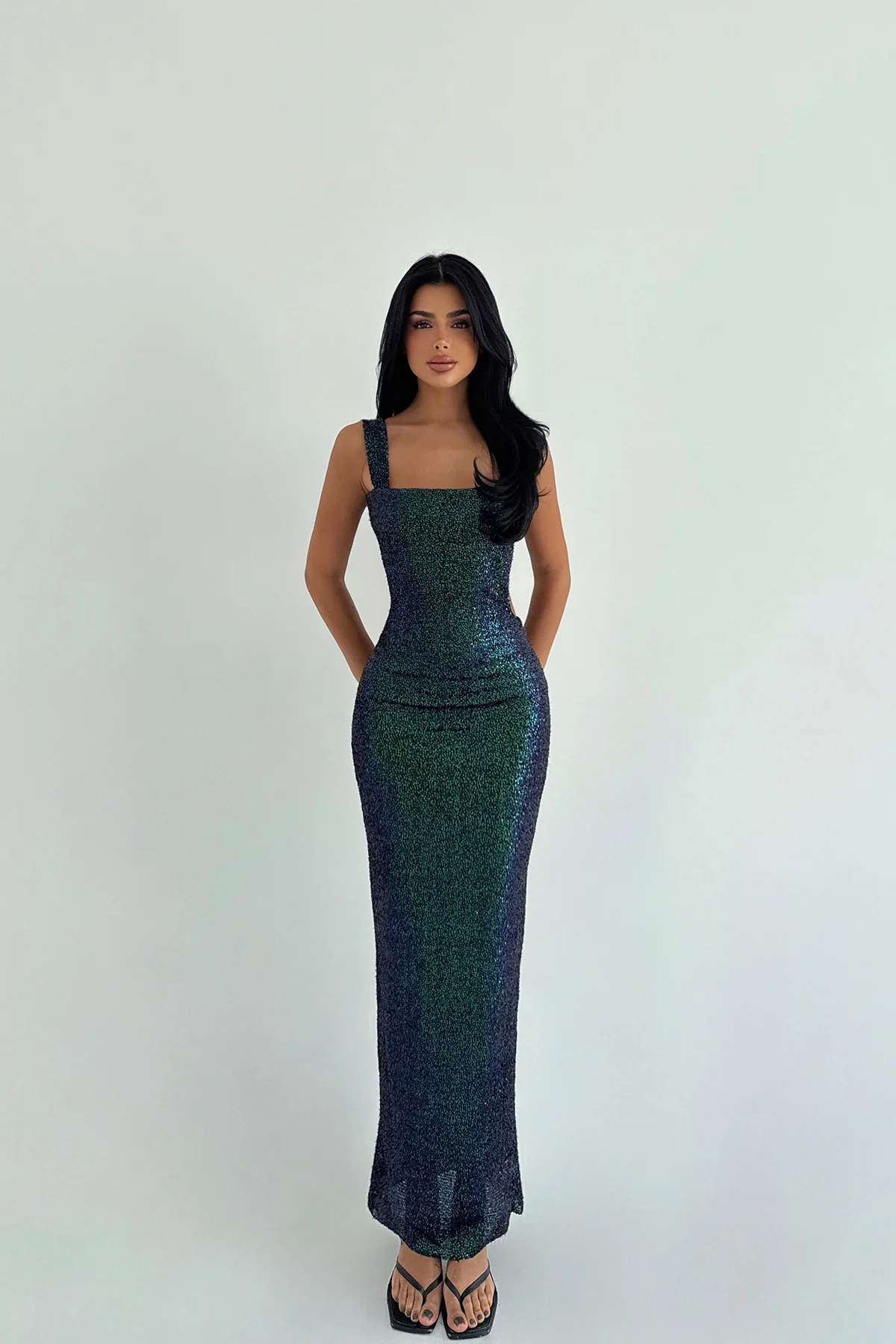 فستان نسائي طويل بحمالة رفيعة وياقة U وقصة A شكل - Beyond Store