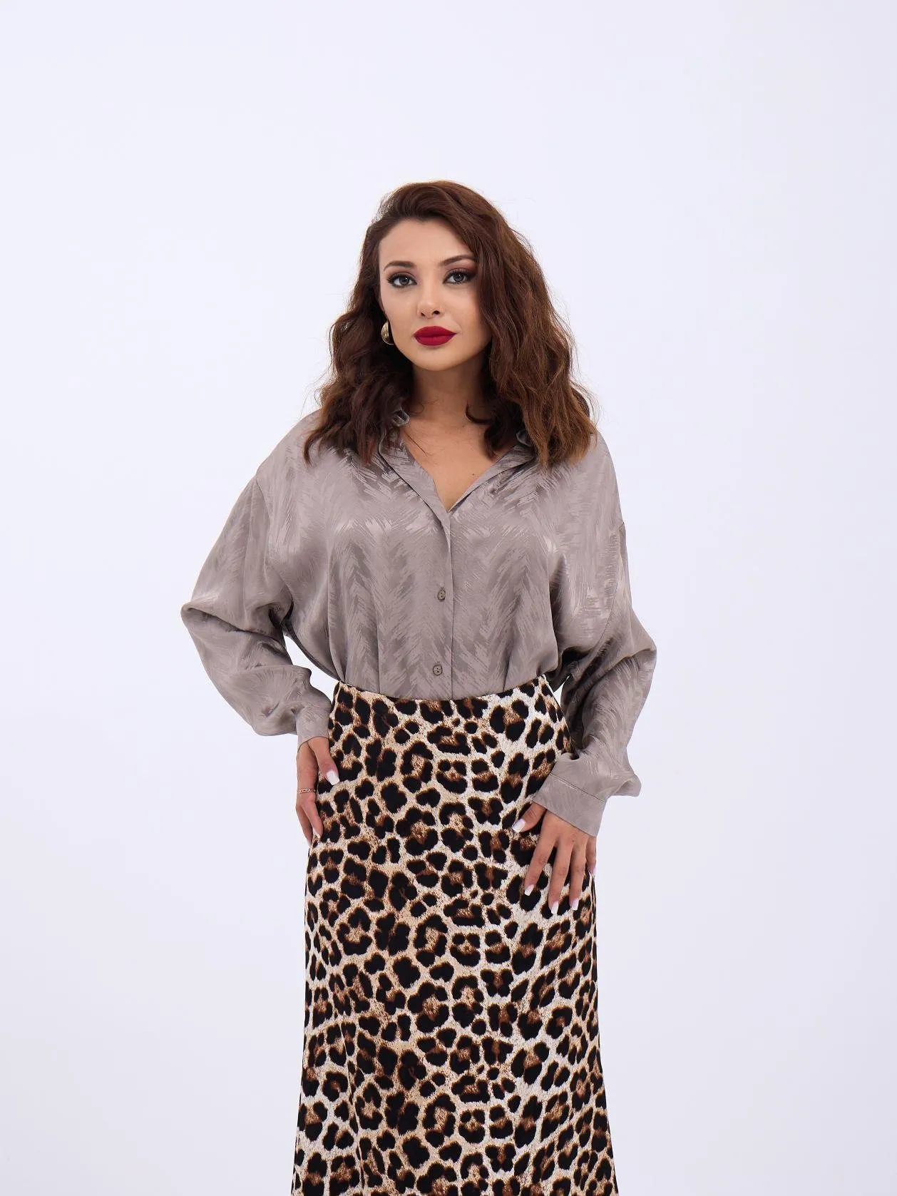 مقاسات الموديل: الطول: 176 سم، الصدر: 90 سم، الخصر: 63 سم، الورك: 94 سم