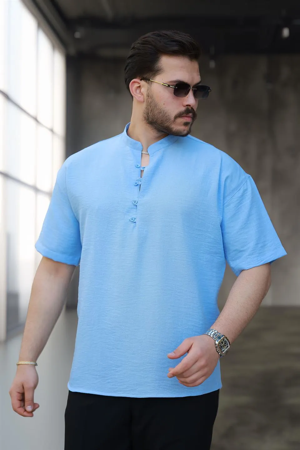 قميص رجالي فضفاض بأكمام طويلة وأزرار كبس