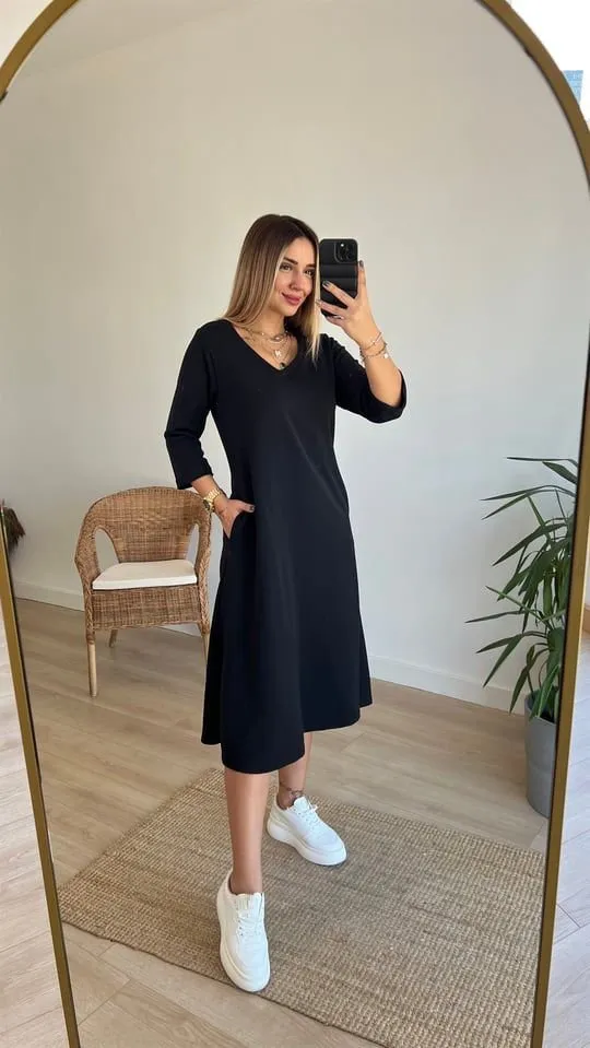 فستان كاجوال متوسط الطول منقوش بأكمام ثلاثة أرباع للنساء
