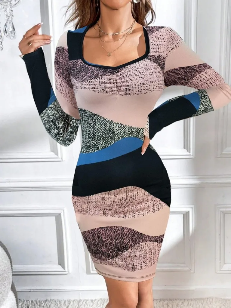 فستان كاجوال منقوش بقصّة عادية وأكمام طويلة ورقبة دائرية